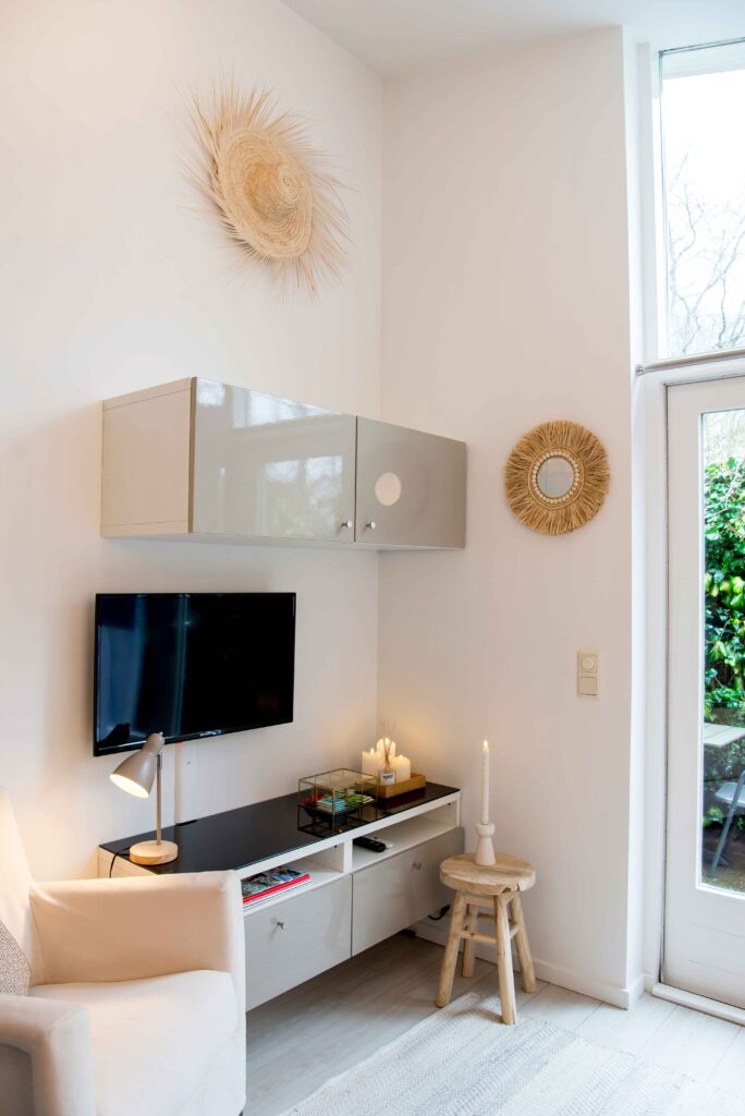 Der Schlafbereich ist eingerichtet mit moderne Kleiderschränke. Das Bett, ein kwalitäts Boxspringbett (160×200), is am Fussende durch die Wand, die den Raum aufteilt, getrennt vom Wohnzimmer. Deswegen fühlt es sich an wie ein separates Schlafzimmer.